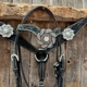 Browband and breastcollar is black leather with a floral tooled design. Decorated with antique silver Clear crystal conchos and black rhinestone rosettes.