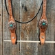 Browband, one ear and breastcollar are light oil basketweave style. They are decorated with copper flower with turquoise colored center stone western conchos (W132), leather rosettes and brown fringe.