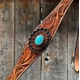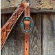 Browband and breastcollar in light oil floral style. They are decorated with turquoise colored cabochons and copper turquoise western buckles.