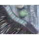 Dark leather tripping collar featuring teal aztec print leather inlay accented with teal buck stitch and oily leather fringe. Tripping collar is 4" wide and has double tugs.