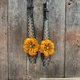One Ear headstall and Breastcollar are designed with floral tooling, half flower turquoise trim, and diamond accents. They are decorated with round turquoise cabochons and yellow gardenias.