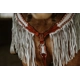 Beautiful medium oil headstall and breast collar set featuring inlay white gator print hide, accented with white smooth leather fringe on breast collar, white buck stitch, floral tooling and antique copper conchos and silver buckles. Comes as a browband headstall and the one ear piece to swap out to which ever style you like best.