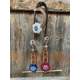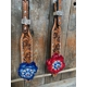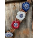 One ear and breastcollar is light oil floral silver buckstitch and dots style. They are decorated with bright silver Ruby/Clear/Capri crystal conchos/buckles and red, white and blue carnations.